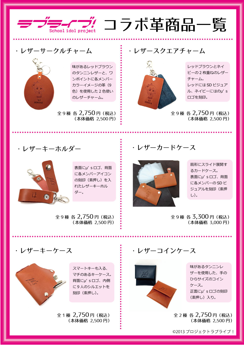 劇中衣装、楽曲衣装、メンバーカラーなど様々にイメージを膨らませながら、レザーグッズを楽しんで作成できます。