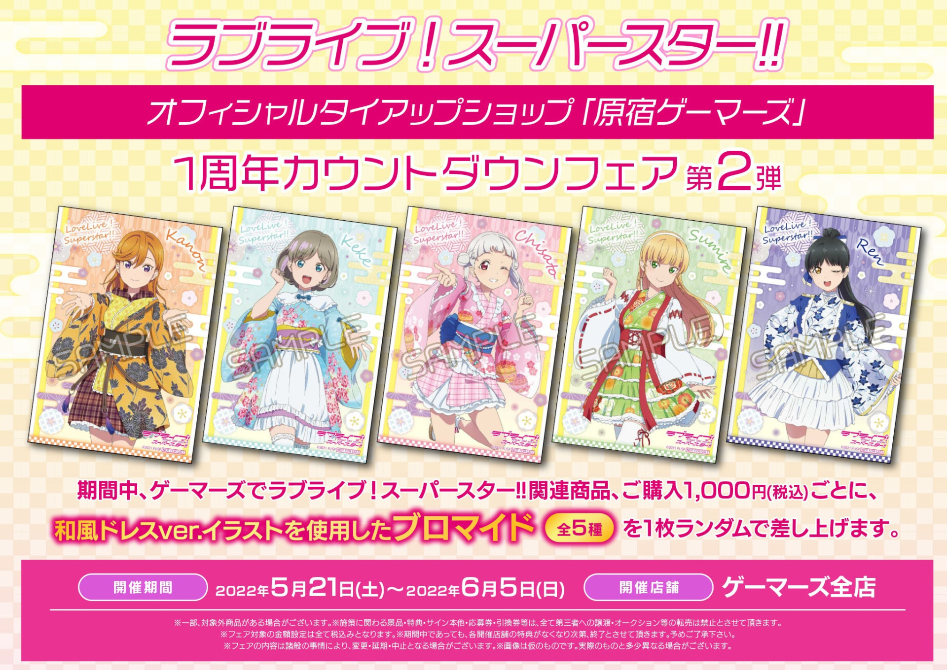 期間中、原宿ゲーマーズでラブライブ!スーパースター!!関連グッズ(映像、音楽商品、書籍を除く)、ご購入1,000円(税込)ごとに、ご挨拶カード(全9種)をランダムで1枚差し上げます。